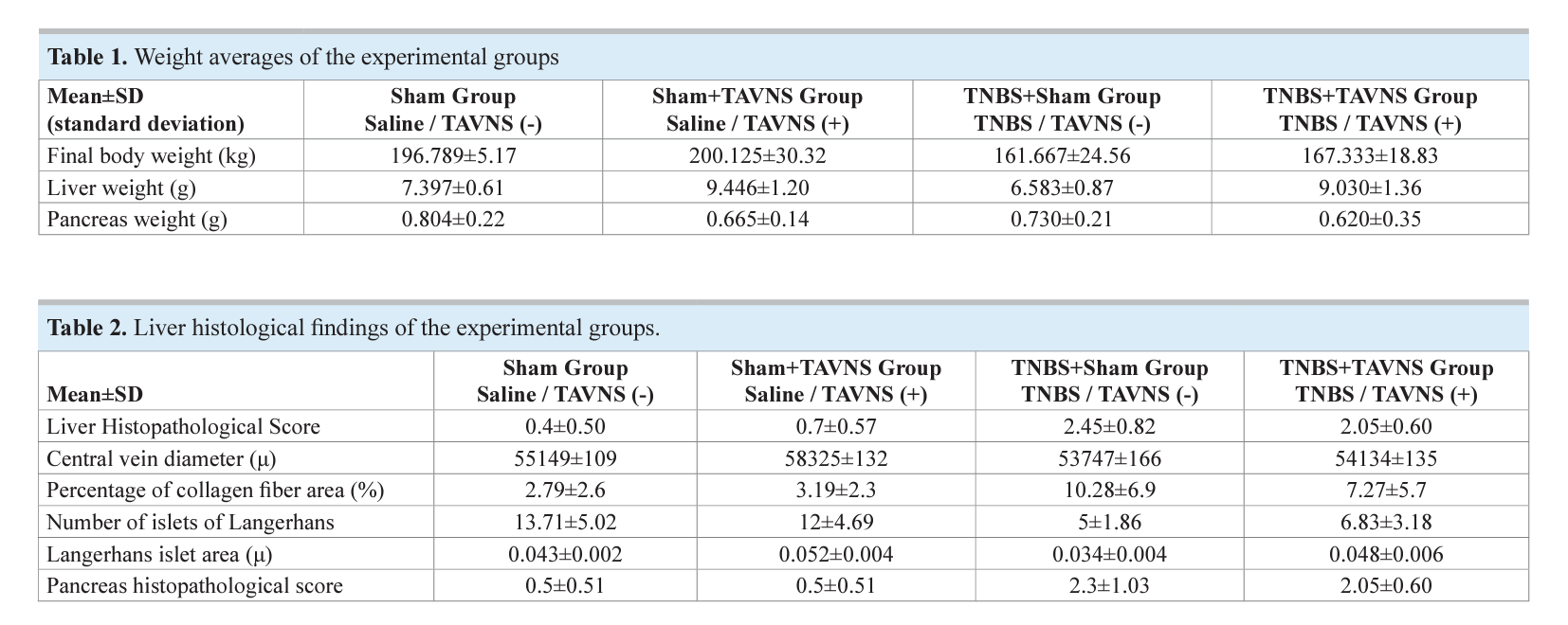 Conclusion: In this study, we found that TNBS-induced colitis in rats caused histopathological and histomorphometric changes in the liver and pancreas, causing weight loss, and that TAVNS had therapeutic effects on these changes.