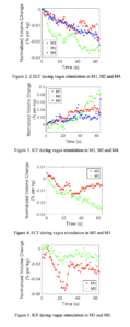 Abstract: In this paper, we propose multifrequency body impedance measurement technique for monitoring the onset of vagus nerve stimulation. In response to transcutaneous electrical vagus stimulation, changes occur in body fluids i.e. fluid shifts in extracellular and intracellular media that can be assessed by Cole parameters Re and Ri before and after stimulus, by measuring single side impedance spectroscopy (from 3 kHz to 1MHz) between wrist and ankle. Following a resting period of 5 minutes in supine position, auricular vagus nerve was stimulated for 3 minutes and BIS performed every 10 seconds, on 23-27 years old, 5 healthy subjects. During the stimulation phase, either an increase or a decrease was observed in extracellular and intracellular fluids. In 3 of the subjects, an ECF decrease of 0.02% per kg was compensated by 0.02 to 0.06% per kg increase in ICF; with a correlation coefficient of -0,70 to -0,79; suggesting fluid shifts between ECF and ICF. With the other 2 subjects, both ECF and ICF decreased by about 0.02% per kg. The study was performed with a limited number of participants; to reach statistically meaningful results measurements will be performed over a larger sample size.