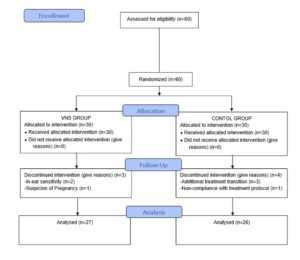 Methods: Sixty patients, who had neck pain, met the diagnostic MPS criteria of Travell and Simons were included in the study. The subjects were randomly divided into VNS group (n = 30) or control group (n = 30). Each group performed 10 sessions of TP ischemic compression and stretching exercises (5 days/week). Ten sessions of 30-minute long auricular VNS were added to the treatment in VNS group. Pain severity [Visual Analogue Scale (VAS)], TP sensitivity (algometer), grip strength (Jamar dynamometer), quality of life [Short Form-36 (SF-36)] and autonomic function [Composite Autonomic Symptom Scale-31 (Compass-31)] were evaluated before and after 10 sessions of treatment.