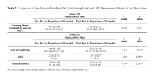 Results: The analysis revealed no statistically significant differences between the groups concerning variables such as body mass index (BMI), age, gender, educational background, and smoking status (p>0.05). However, within-group evaluations exhibited significant differences compared to baseline values in terms of nerve conduction velocity, pain perception, and upper extremity functionality, with no such difference observed in grip strength (p<0.05). The intergroup comparisons indicated a significant difference in favor of the experimental group across all parameters, except for grip strength (p<0.05); conversely, no substantial differences were observed between the sham and control groups (p>0.05).