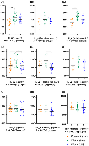 Abstract: Autism is a neurodevelopmental disorder with limited treatment alternatives and which incidence is increasing. Some research suggests that vagus nerve simulation might lead to the reduction of certain symptom. The autism model was induced by oral VPA administration (600 mg·kg−1) to C57BL/6 pregnant mice on E12.5 days. The study included three groups: the VPA Transcutaneous Auricular Stimulation Group (VPA + tVNS), the VPA Control Group (VPA + sham), and the Healthy Control Group (Control + sham). Each group included 16 mice (8 M/8 F). Our results show that serum IL-1β and IL-6 levels were significantly higher in male VPA-exposed mice than controls. However, IL-1β was significantly lower, and IL-6, TNF- α, and IL-22 were not different in female VPA-exposed mice compared to the control group. Brain NLRP3 levels were significantly higher in both sexes in the VPA autism model (P < 0.05). tVNS application increased brain NLRP3 levels in both sexes and reduced serum IL-1β levels in male mice. We conclude that cytokine dysregulation is associated with the VPA-induced adult autism model, and the inflammatory response is more pronounced in male mice. tVNS application altered the inflammatory response and increased brain NLPR3 levels in both sexes. Further studies are needed to understand the beneficial or detrimental role of the inflammatory response in autism and its sexual dimorphism.