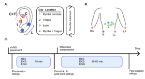 Abstract: Vagus nerve signals from the gut to brain carry information about nutrients and drive food reward. Such signals are disrupted by consuming large amounts of high-calorie foods, necessitating greater food intake to elicit a similar neural response. Non-invasive vagus nerve stimulation (nVNS) via a branch innervating the ear is a candidate treatment for obesity in humans. There is disagreement on the optimal location of nVNS in the ear for experimental and clinical studies. There are also no studies comparing nVNS in hungry and post-prandial states. We aimed to compare ear position(s) for nVNS and explore the effects of nVNS during hungry and post-prandial states on proxies for autonomic outflow (heart-rate variability) and efferent metabolism (gastric wave frequency and resting energy expenditure). In a within-subject design, 14 participants (10 women, on average 29.4 +/- 6.7 years old) received nVNS in four different locations (cymba conchae, tragus, earlobe, or tragus AND cymba conchae) on separate days. In each session, participants were asked to consume a palatable chocolate flavored milk. With electrography on the abdomen and indirect calorimetry in a canopy, we measured electro-cardiogram, electro-gastrogram and resting energy expenditure for 15 min before and at least 35 min after consumption of the palatable drink. We also collected ratings of the palatable drink and internal and other states. Pre-drink consumption (in a hungry state) we observed no differences in the effect of location of acute nVNS on resting energy expenditure and gastric wave measures. However, nVNS in cymba conchae decreases heart-rate variability (relative to sham) and ratings of how much participants want to consume the drink (relative to tragus AND cymba conchae and a trend relative to sham). After drink consumption and with continued nVNS, gastric wave frequency is unchanged, and resting energy expenditure increases regardless of stimulation location. Heart-rate variability decreases in all locations, except cymba conchae. We also observe a trend for an increase in gastric wave amplitude in late post-drink consumption time-points in cymba conchae. We observe no support for the combined stimulation of tragus AND cymba conchae being more effective than either of the individual locations. These results suggest that nVNS in the cymba conchae in a hungry state has a similar acute effect on vagal tone as food consumption: to decrease heart rate variability. This effect then negates the usual postprandial effects of a decrease in heart rate variability as seen in the other nVNS locations. These preliminary observations suggest that nVNS in cymba conchae may act primarily on vagal afferent autonomic (and only modestly on metabolic output) in a similar way as food consumption does.