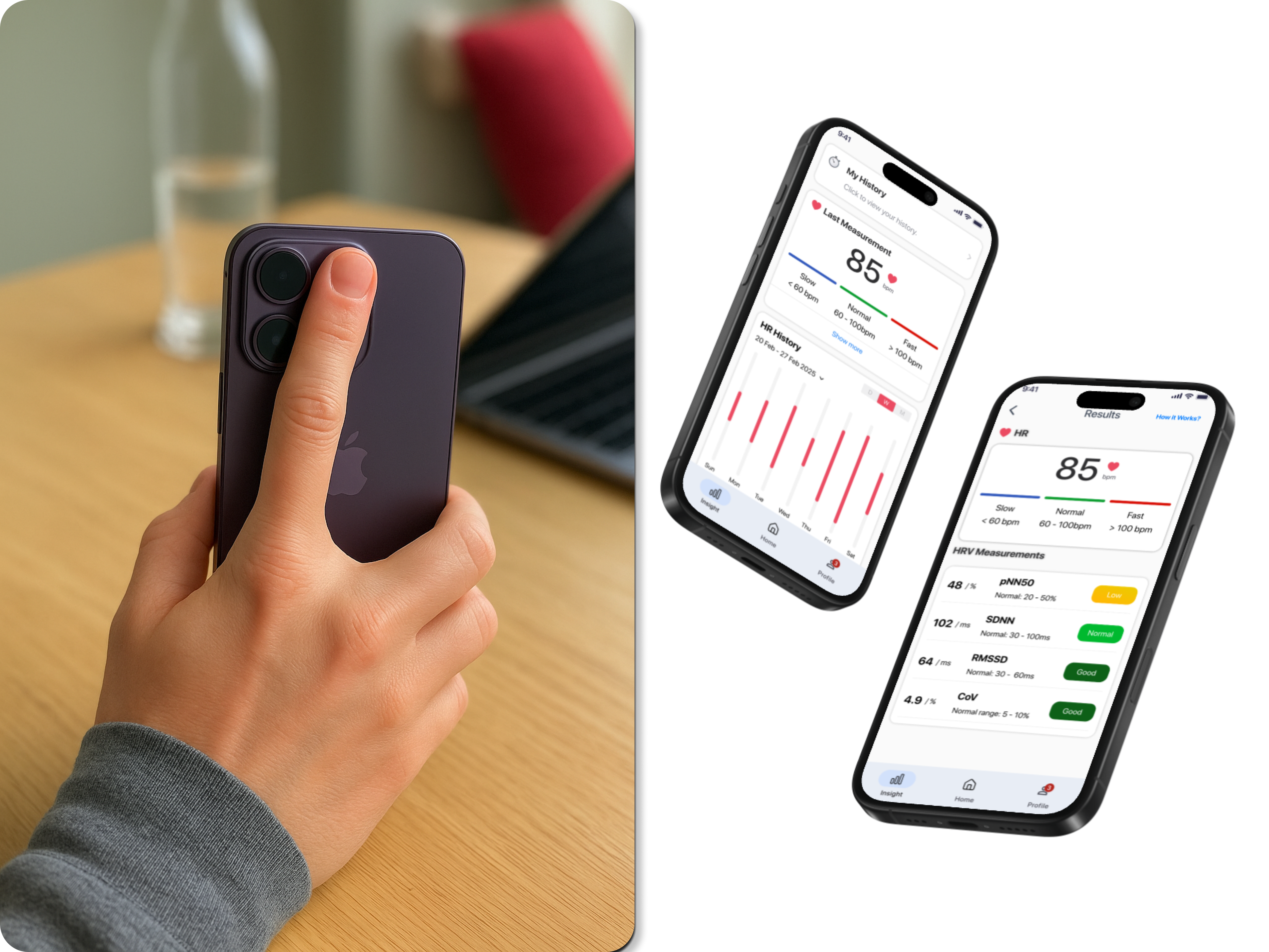 The Vagustim App features built-in stress level tracking via your smartphone camera—no wearables required. By simply placing your finger over the lens, you can gain valuable insights into relaxation, recovery, and overall well-being.