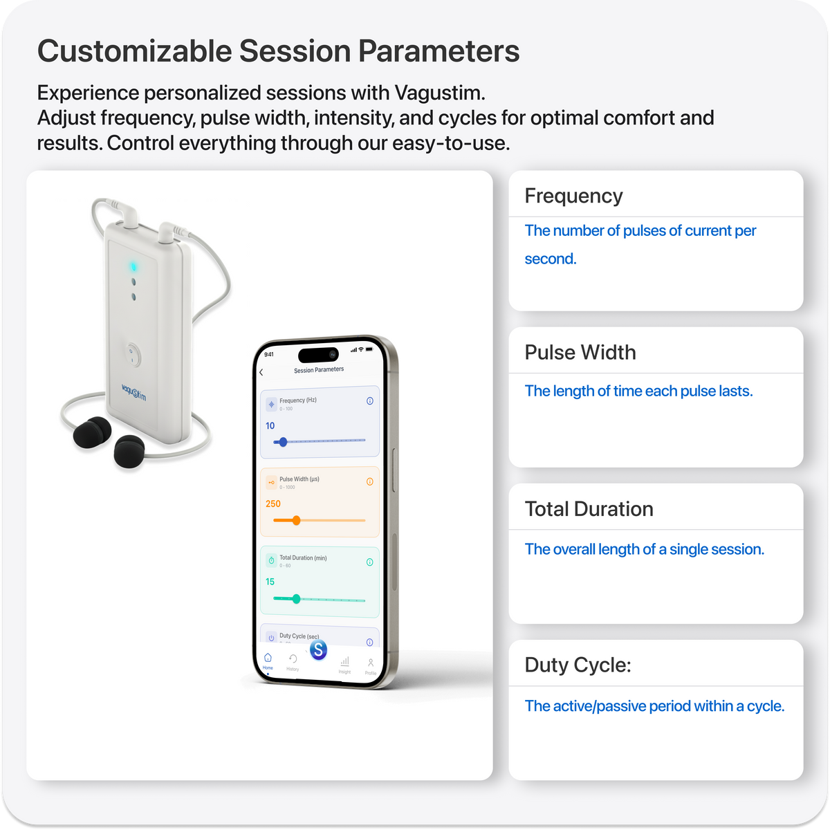Vagustim activates the vagus through the ear. The device is controlled via the Vagustim mobile app, which connects using Bluetooth Low Energy (BLE). Available on both the iOS App Store and Google Play Store, the app allows you to adjust sessions for a personalized experience.